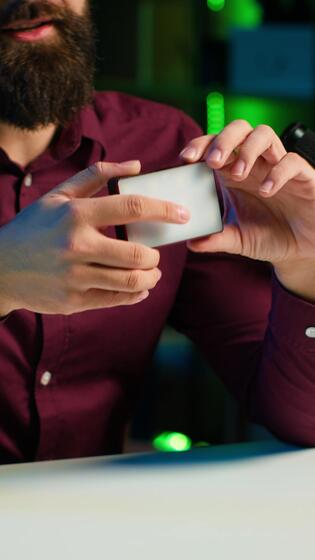 Vertical Reviewer discussing with viewers about mini led lights during live broadcast on internet, close up. Influencer chatting with fans during stream, filming RGB lighting device in studio, camera A Pro Video
