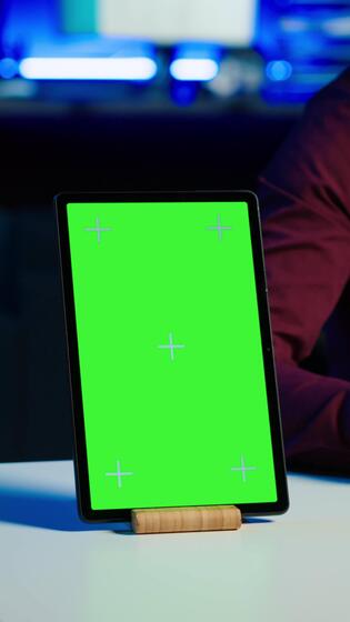 Vertical Happy influencer in studio filming chroma key tablet review for tech enthusiasts. Joyful media star hosts technology internet show, unboxing isolated screen digital portable device, camera A close up Pro Video