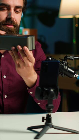 Vertical Influencer does technology review of wireless portable speaker for internet platforms channel, filming with mobile phone. Influencer showing music playing device, recording with smartphone, camera A Pro Video