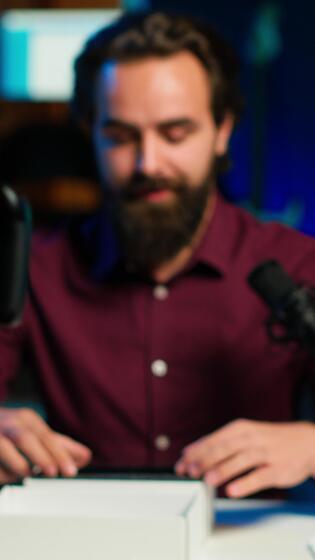 Vertical Tech guru assessing smartphone performance, feeling happy with high quality components used. Content creator shoots mobile phone review for online channel, recommending it, camera A Pro Video