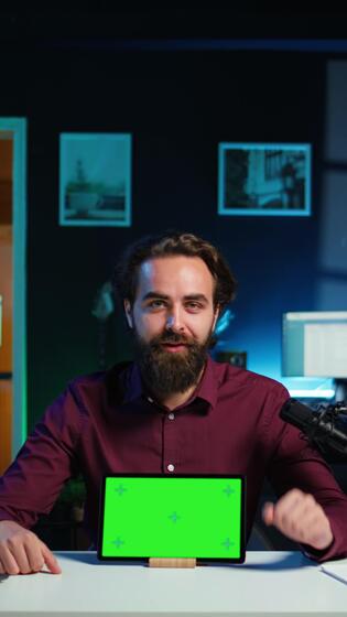 Vertical Smiling man in studio filming chroma key tablet review for tech enthusiasts. Cheerful online star hosts technology internet show, unboxing green screen digital portable device, camera B Pro Video