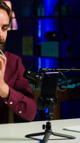 Vertical Tech guru presenting V mount battery, filming technology review using cellphone on tripod and professional microphone. Caucasian vlogger showcases charging device specs, recording with phone, camera A Pro Video
