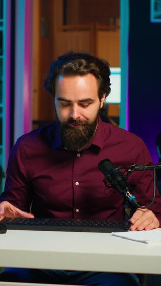 Vertical Man filming for online channel in dimly lit home studio, presenting mouse and keyboard to audience. Content creator showing viewers computer peripherals, giving honest opinion, camera A Pro Video