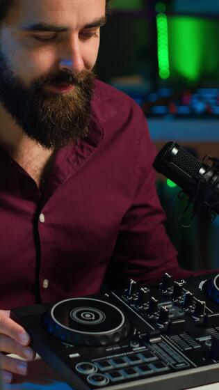 Vertical Tech guru filming technology review of newly released DJ controller, unboxing it and presenting specifications to audience. Influencer showing sound mixer equipment to followers, camera A Pro Video