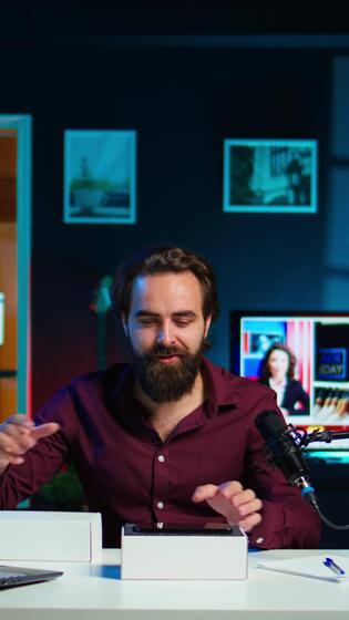 Vertical Tech influencer filming technology review of newly released smartphone, unboxing it and presenting specifications to audience. blogger showing phone to subscribers, camera B Pro Video