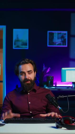 Vertical Man in studio reviewing gaming keyboard received from sponsoring brand. Online show host paid to promote bluetooth wireless computer peripheral to viewers during live broadcast, camera B Pro Video
