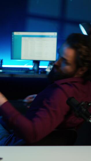 Vertical Childish man doing creative intro for vlog, using microphone to shoot . Energetic content creator spinning on chair while filming for vlogging channel with mic in home studio, camera A Pro Video