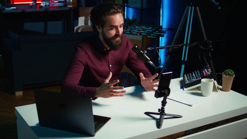 Media star talking in front on smartphone attached to tripod stabilizer in studio, discussing with viewers. Man using mobile phone to record in living room for social media, camera B Pro Video