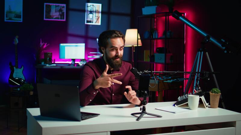 Influencer talks in front on smartphone attached to tripod and high quality mic in studio, discussing with viewers. Man using mobile phone and professional gear to record social media , camera B Pro Video