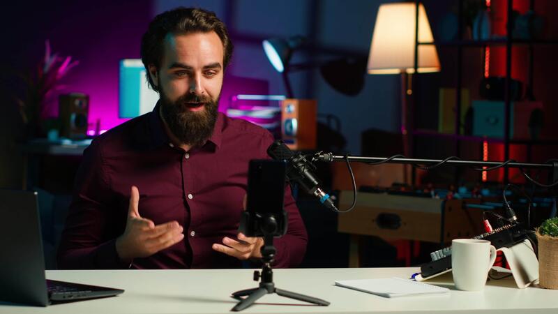 Media star talking in front on smartphone attached to tripod stabilizer in studio, discussing with viewers. Man using mobile phone to record in living room for social media, camera A Pro Video