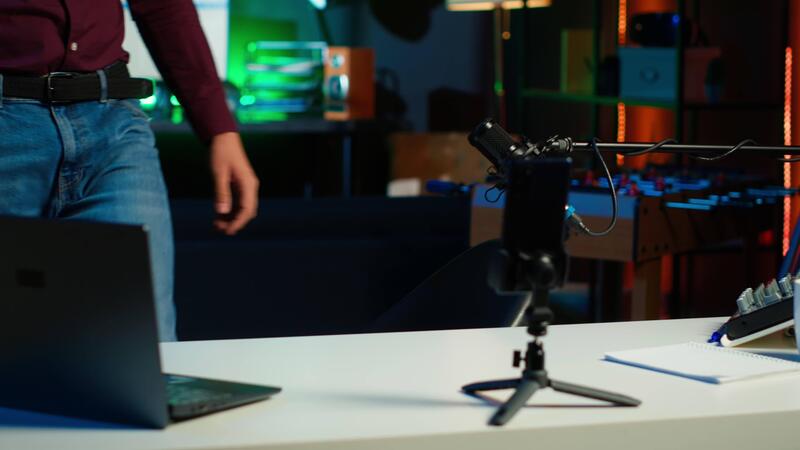 Online star hosting online show in neon lit studio, shooting vlog using mobile phone. Man presenting informations during streaming service broadcast filmed cellphone on tripod, camera A Pro Video
