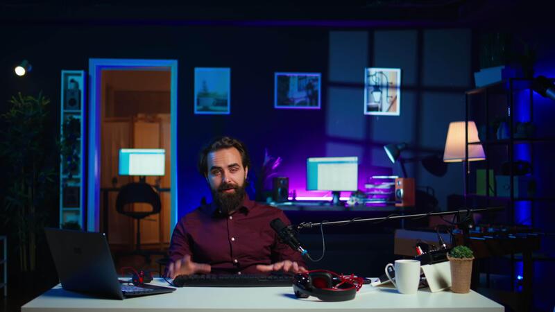 Man in studio reviewing gaming keyboard received from sponsoring brand. Online show host paid to promote bluetooth wireless computer peripheral to viewers during live broadcast, camera B Pro Video