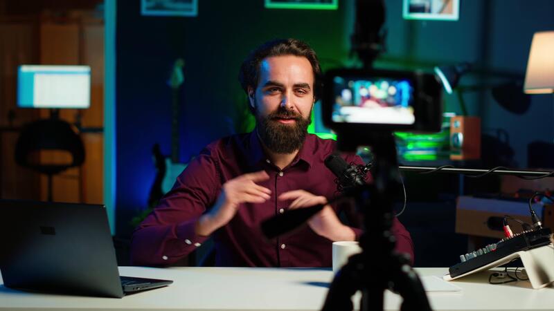 Upbeat content creator hosting online show in rgb lights studio, shooting vlog using professional microphone. Cheerful vlogger presenting informations during streaming service broadcast, camera A Pro Video