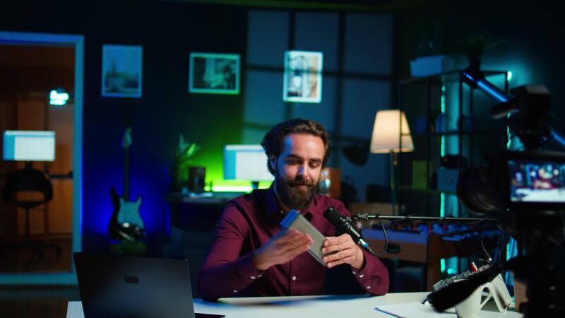 Man doing technology review of wireless portable speaker for internet vlogging channel. Music playing device held by content creator showing it to his subscribers, camera B Pro Video