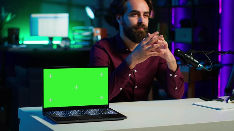 Tech guru in studio filming tech tutorial on how to do maintenance on chroma key laptop. Internet show host teaching viewers how to open and repair damaged green screen notebook, camera A Pro Video