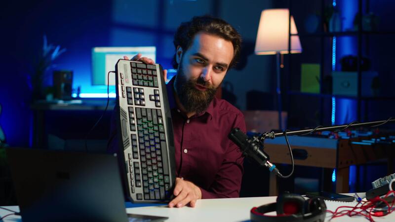 Influencer in studio reviewing gaming keyboard, mouse and headphones. Online show host filming electronics haul, presenting wired computer peripherals to viewers during live broadcast, camera A Pro Video