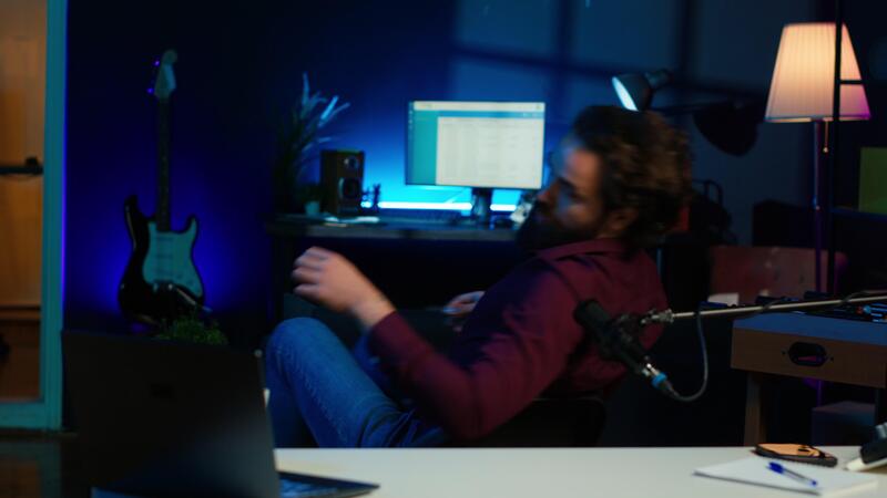 Childish man doing creative intro for vlog, using microphone to shoot . Energetic content creator spinning on chair while filming for vlogging channel with mic in home studio, camera A Pro Video