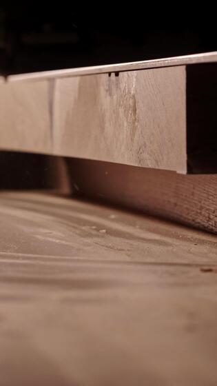 Unrecognizable man working with professional, electric circular saw, making a precise cut along the guide on a wooden surface. Tool is connected to a dust extraction system. Woodworking workshop Free Video