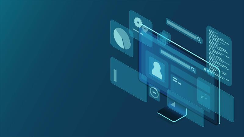 Computer monitor animation with blue virtual holographic projections with graphs and charts for data analysis. Analytics data on monitor. Web development concept. 4K animated in isometric style Pro Video