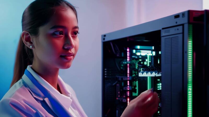 Woman IT specialist fixing server rack glowing LED engineer system administrator girl software hardware security cloud computing AI expert specialist technology data center network Pro Video