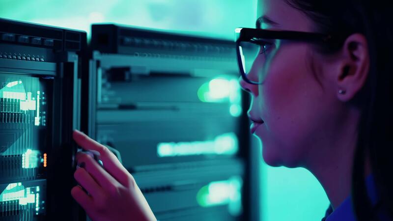 IT specialist fixing server rack glowing LED engineer system administrator backend software hardware security cloud computing AI training expert specialist technology data center network Pro Video