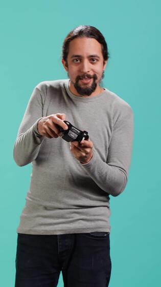 Vertical Cheerful player happy after winning gaming console game, shaking fist, studio background. Portrait of man satisfied after being victorious in videogame, defeating all enemies using gamepad, camera A Pro Video