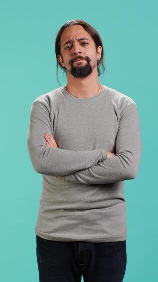 Vertical Man shakes head, showing negative emotion, showing lack of satisfaction, isolated over studio background. Irked person disagreeing with friend during conversation, studio backdrop, camera A Pro Video