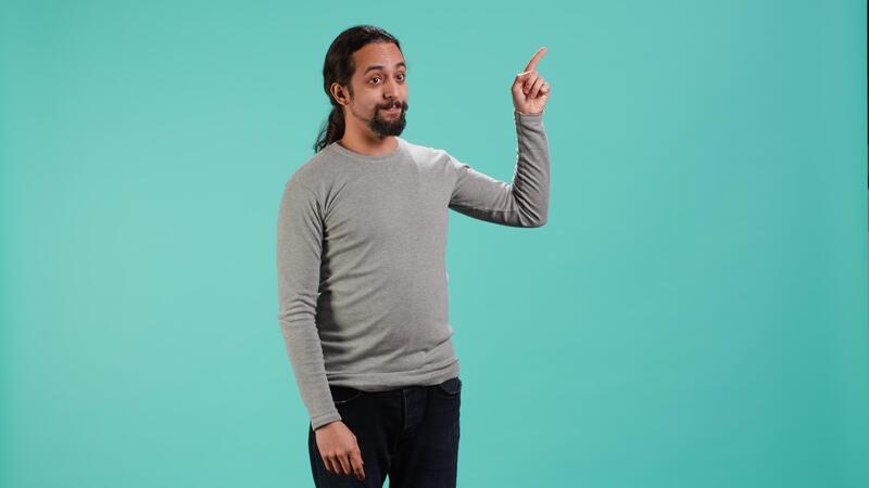 Portrait of smiling salesman pointing around with finger, doing recommendation, talking with audience. Happy person showing copy text space, doing advertisement, studio backdrop, camera A Pro Video