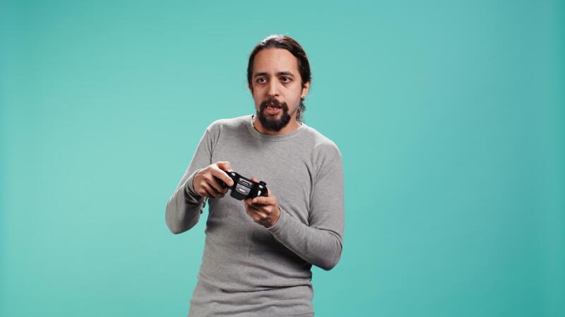 Portrait of gamer annoyed after losing online multiplayer videogame, being defeated by rival players. Man upset after seeing game over message, holding controller, studio background, camera B Pro Video