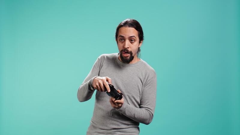Gamer with disappointed look on face after receiving game over screen, holding controller. Man upset after losing videogame, playing with gamepad, isolated over studio background, camera B Pro Video