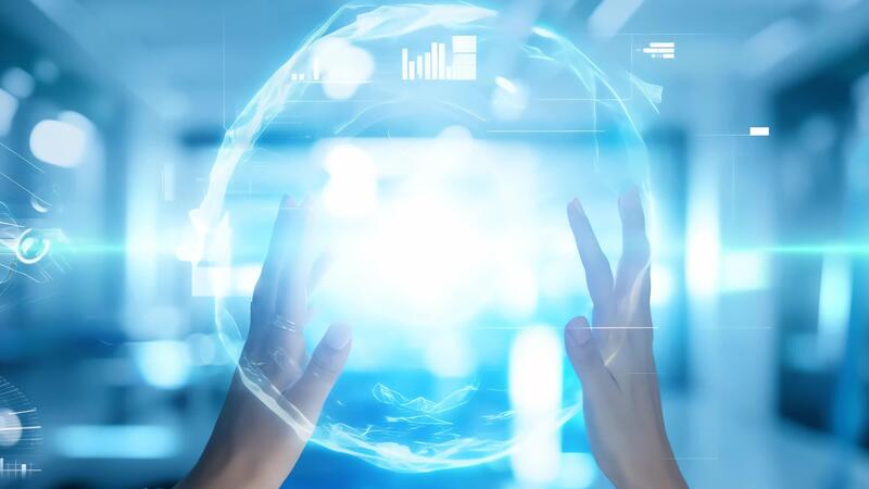 Hands interacting with futuristic digital interface display UI hologram glowing virtual reality smart glass projection AR VR AI technology information statistics business audit Pro Video
