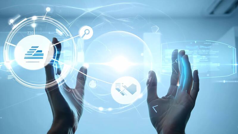 Hands interacting with futuristic digital interface display UI hologram glowing virtual reality smart glass projection AR VR AI technology information statistics business audit Pro Video
