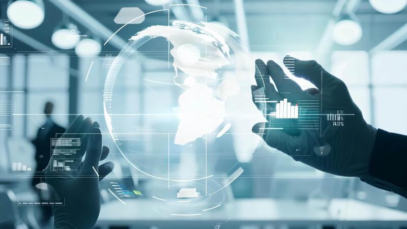 Hands interacting with futuristic digital interface display UI hologram glowing virtual reality smart glass projection AR VR AI technology information statistics business audit Pro Video