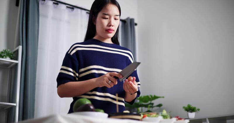 Handheld low angle view shot, Young Asian woman is standing cut grapes in preparation for lunch on a table at home. Healthy food Pro Video