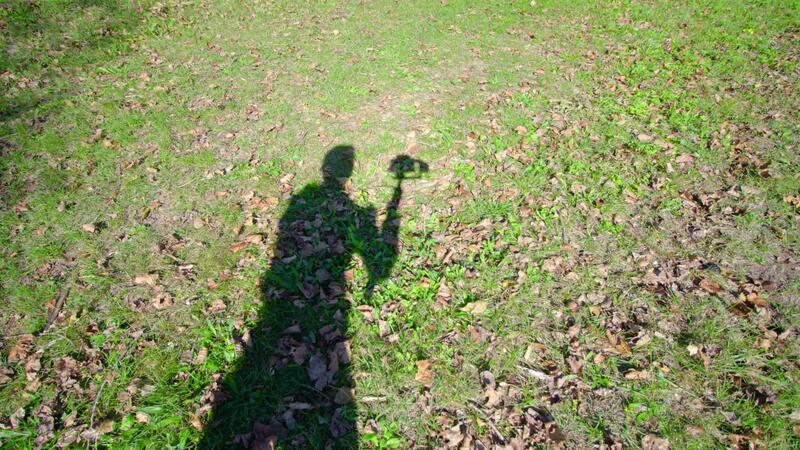 Man operator shadow moving camera on folded tripod on grass Pro Video