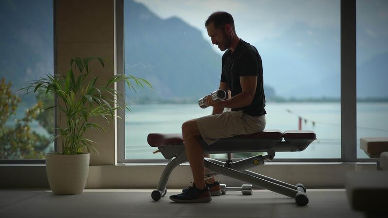 A man is diligently working out with dumbbells next to a large window, enjoying the view Pro Video
