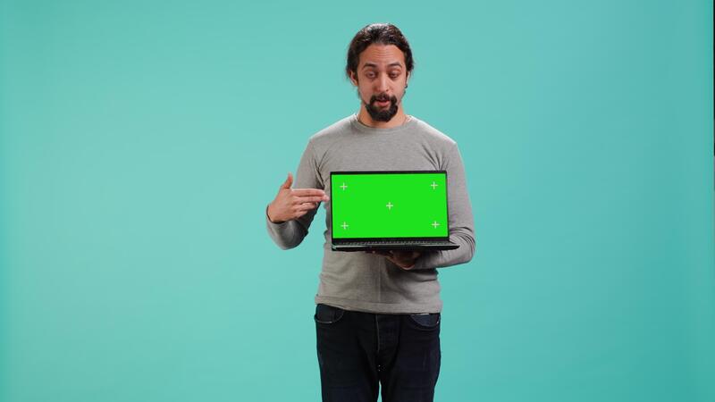 Portrait of worker holding isolated screen laptop, doing important work for company, studio background. Employee with chroma key device at work solving job tasks, camera A Pro Video