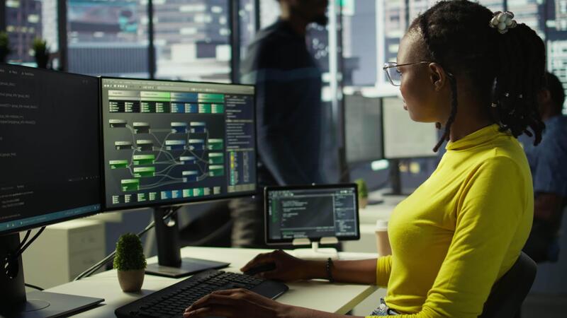 Portrait of smiling computer scientist at work doing software debugging using PC, checking glitches in lines of code. Cheerful IT specialist in office fixing coding issues using computer, camera B Pro Video