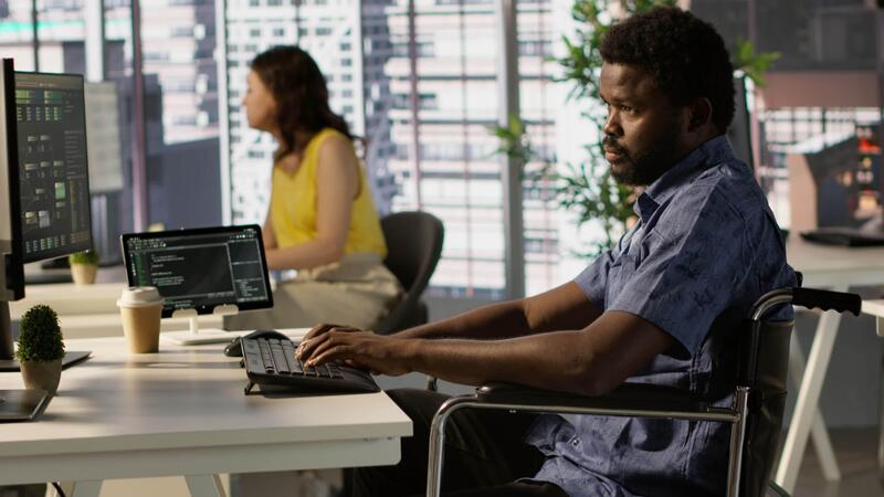 Software technician with disability in inclusive workplace working with machine learning tech. African american IT expert with paraplegia in wheelchair transforms data into predictive models Pro Video