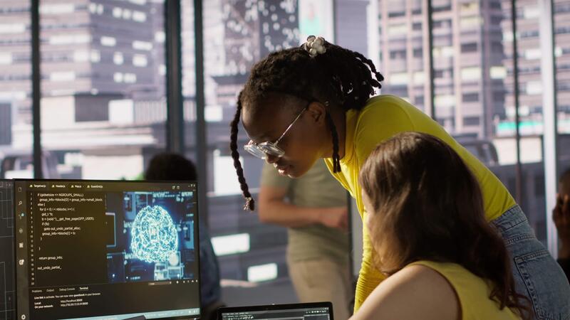 Admin assisted by coworker while utilizing cloud computing resources to train large scale machine learning models. Woman and colleague monitoring AI company systems using computer, camera A Pro Video
