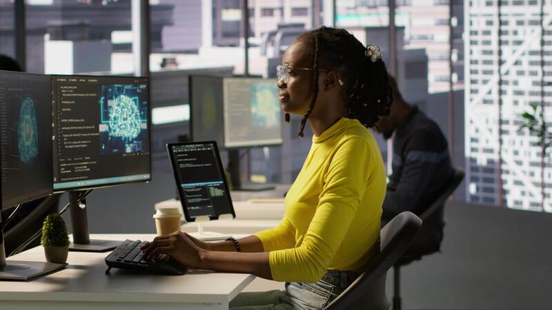 Computer scientist testing AI company software, identifying errors in machine learning tech. African american IT staff member writing artificial intelligence code in programming language, camera A Pro Video
