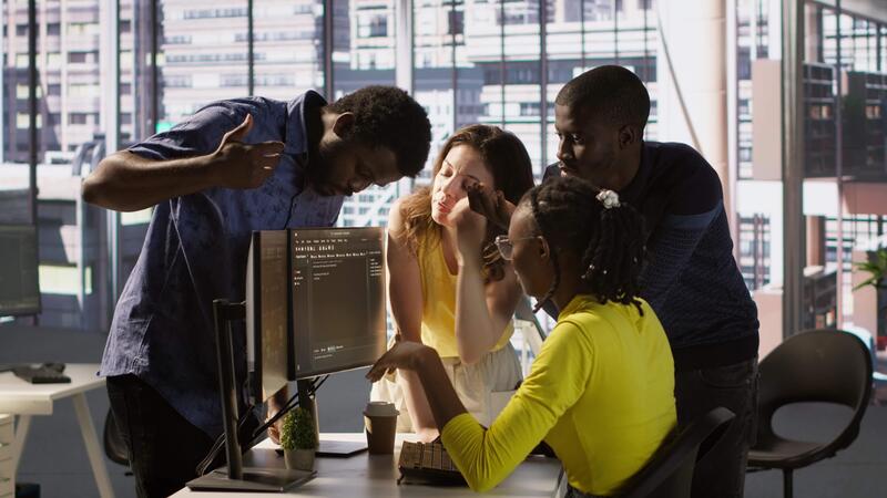 Upset IT workers in office debating, doing brainstorming, looking through lines of code on computer. Team of company employees discussing in workspace, disagreeing with each other, camera A Pro Video