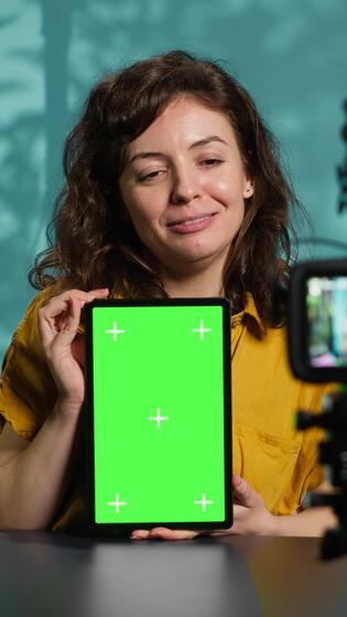 Vertical Woman filming tech tutorial on how to repair damaged mockup tablet using professional camera. Engineer teaching fans to install operating system on green screen device, recording with gear, camera A Pro Video