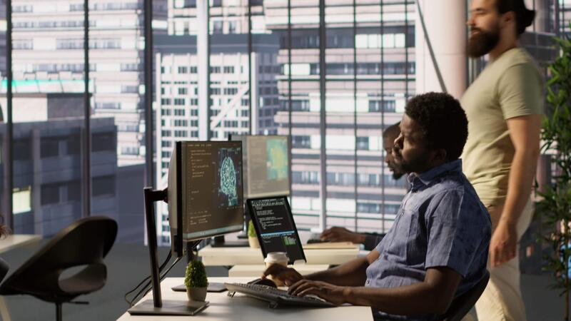 Tired admin stretches limbs while using PC for artificial intelligence computing simulating human brain. Fatigued worker relaxing back, feeling strained after working with AI neural networks, camera A Pro Video