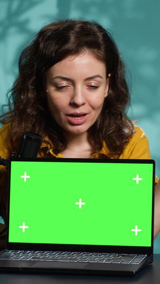 Vertical Influencer in home studio using recording tech to capture live broadcast, reviewing chroma key laptop. Online show host filming electronics haul, presenting green screen notebook for viewers, camera A Pro Video