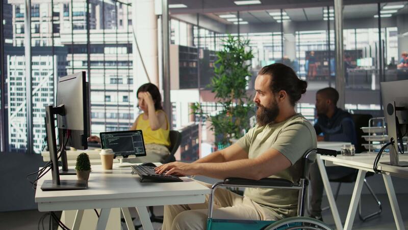 IT worker with disability sitting in wheelchair in office working at computer desk, focused on testing programs. Software engineer with paraplegia in inclusive workplace checking code on PC, camera B Pro Video