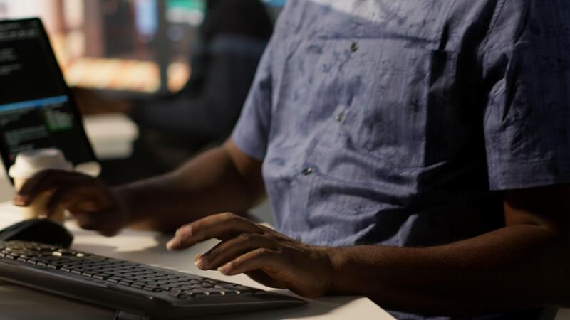 Man doing data entry, typing on keyboard on PC, solving tasks. Close up of office clerk in workspace making sure documents are compliant with quality assurance expectations and standards, camera A Pro Video