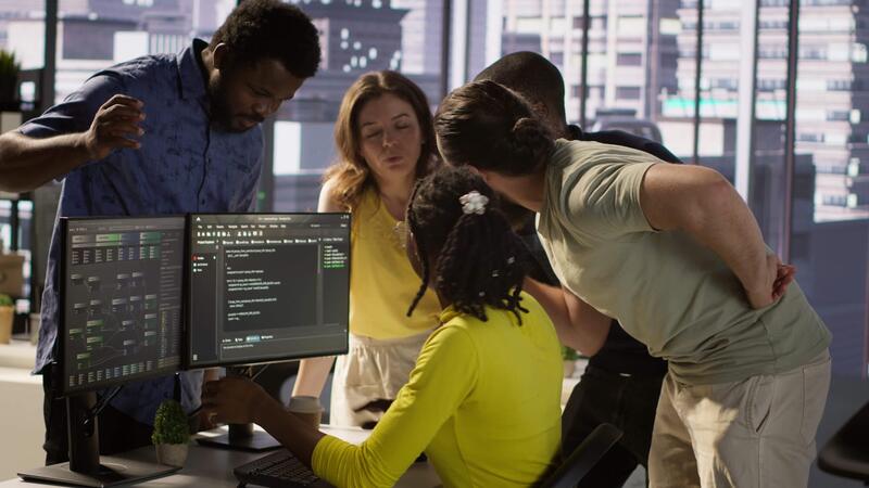 IT staff members arguing, having different ideas while testing and deploying programs and systems. Team of programmers fighting in office while checking code, having disagreement, camera A Pro Video