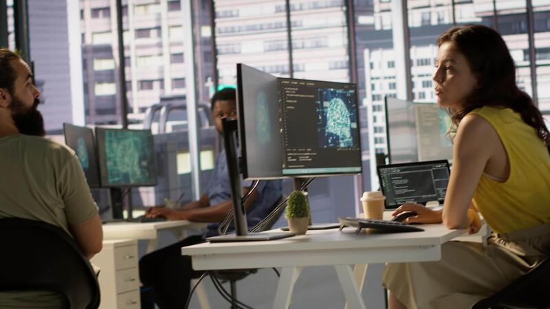Manager discussing with employees in office, developing artificial intelligence machine learning APIs. Team leader doing brainstorming with workers, training AI predictive models, camera A Pro Video