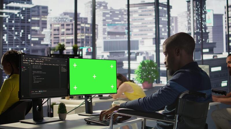 Person with disability testing and deploying programs and systems on green screen PC. Software technician in wheelchair checking code on mockup PC, sitting at desk in office, camera B Pro Video